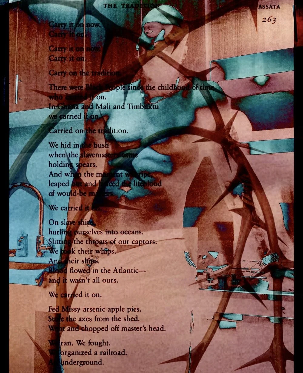 portrait of trade standing in the kitchen, transparent scan of camel thorns on the vachellia erioloba; a tree native to south africa, page 263 of assata by assata shakur; an affirmation titled “the tradition”.